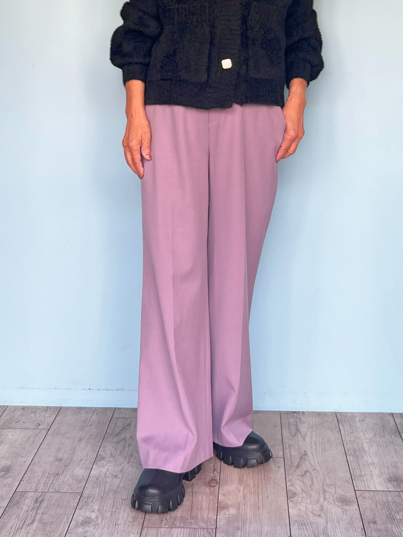 一瞬でコーディネートが決まる、上品で華やかなパープルカラーのワイドパンツ