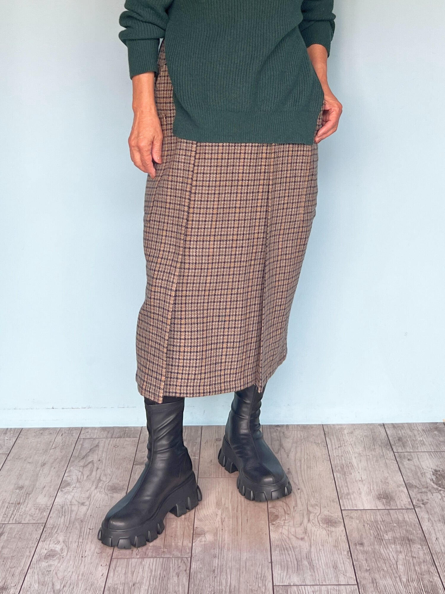 大きめポケットと正面のタックで立体感を演出した大人のチェックスカート