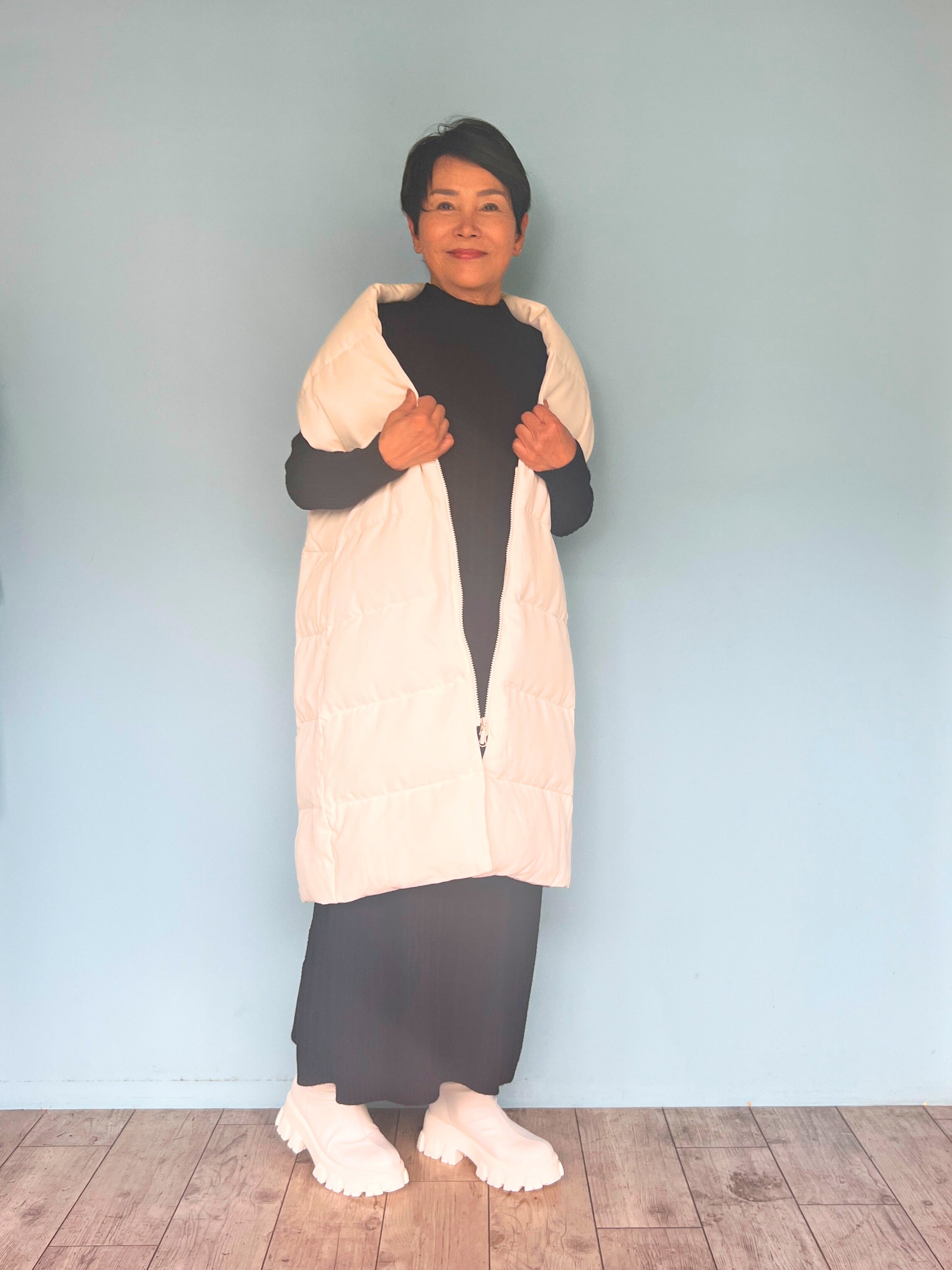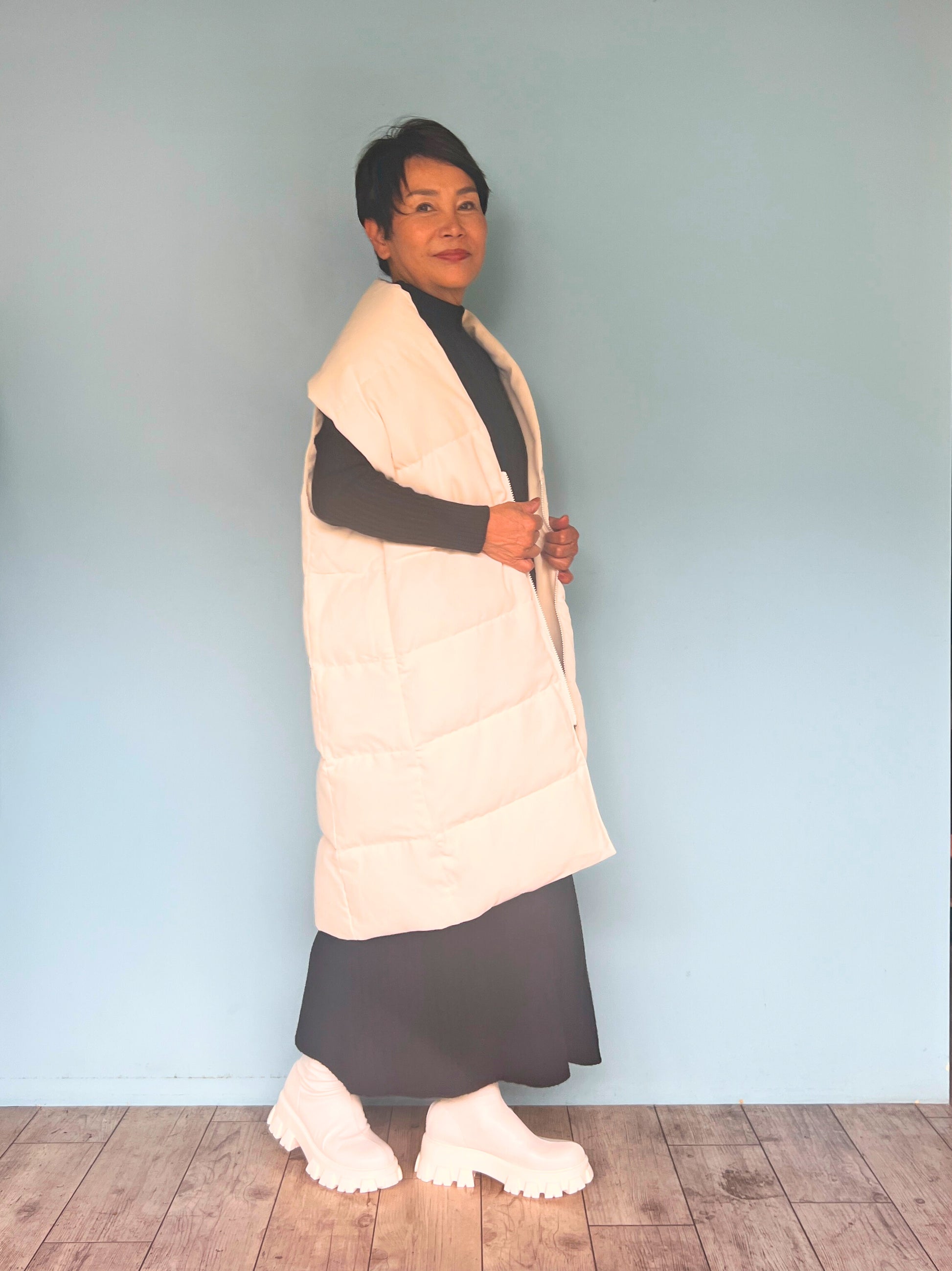 足首まであるロング丈なので、どのような丈の長さのアウターを羽織ってもシルエットを綺麗に見せることができます。