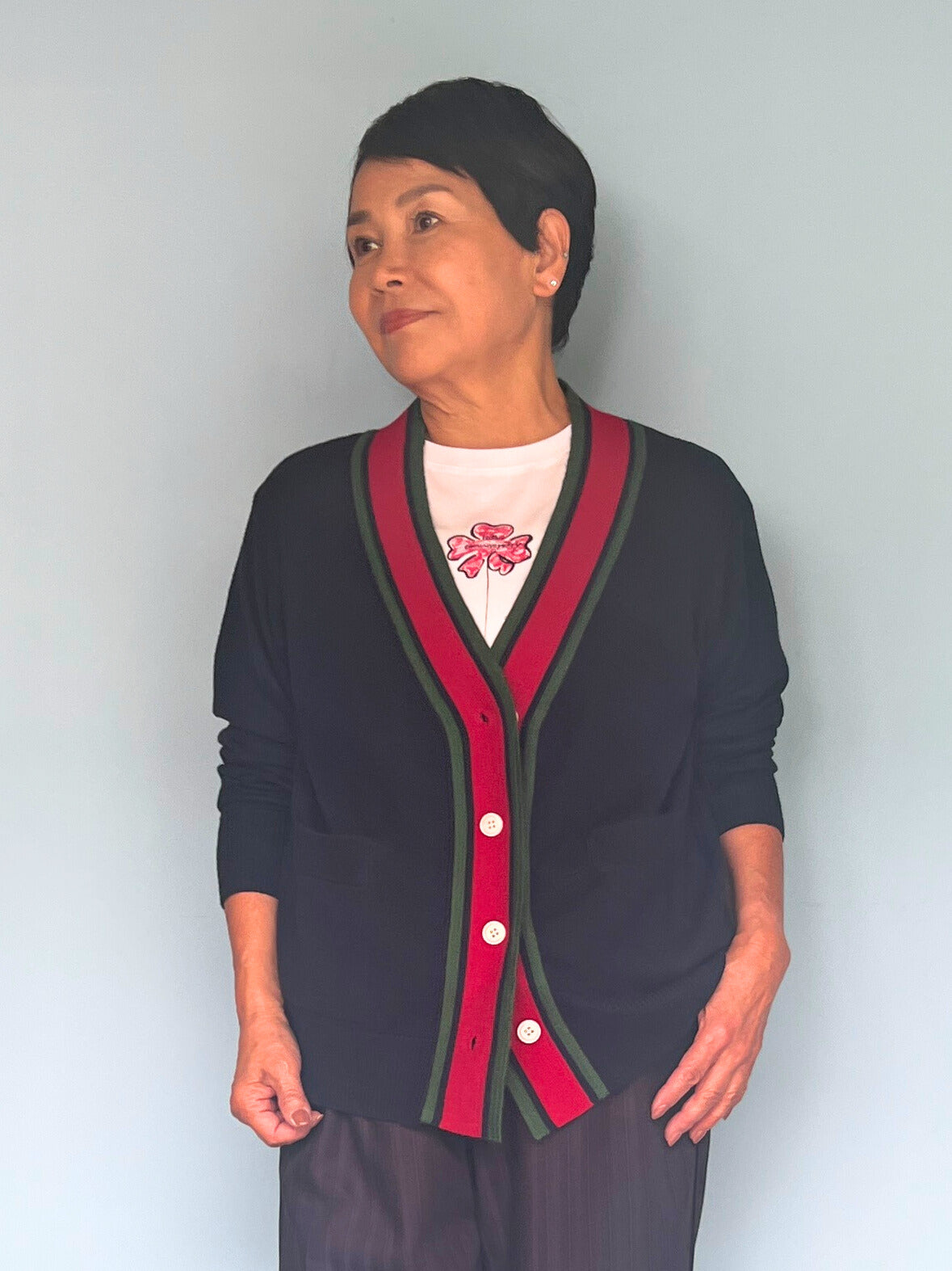 ライトカーディガン ネイビー×赤