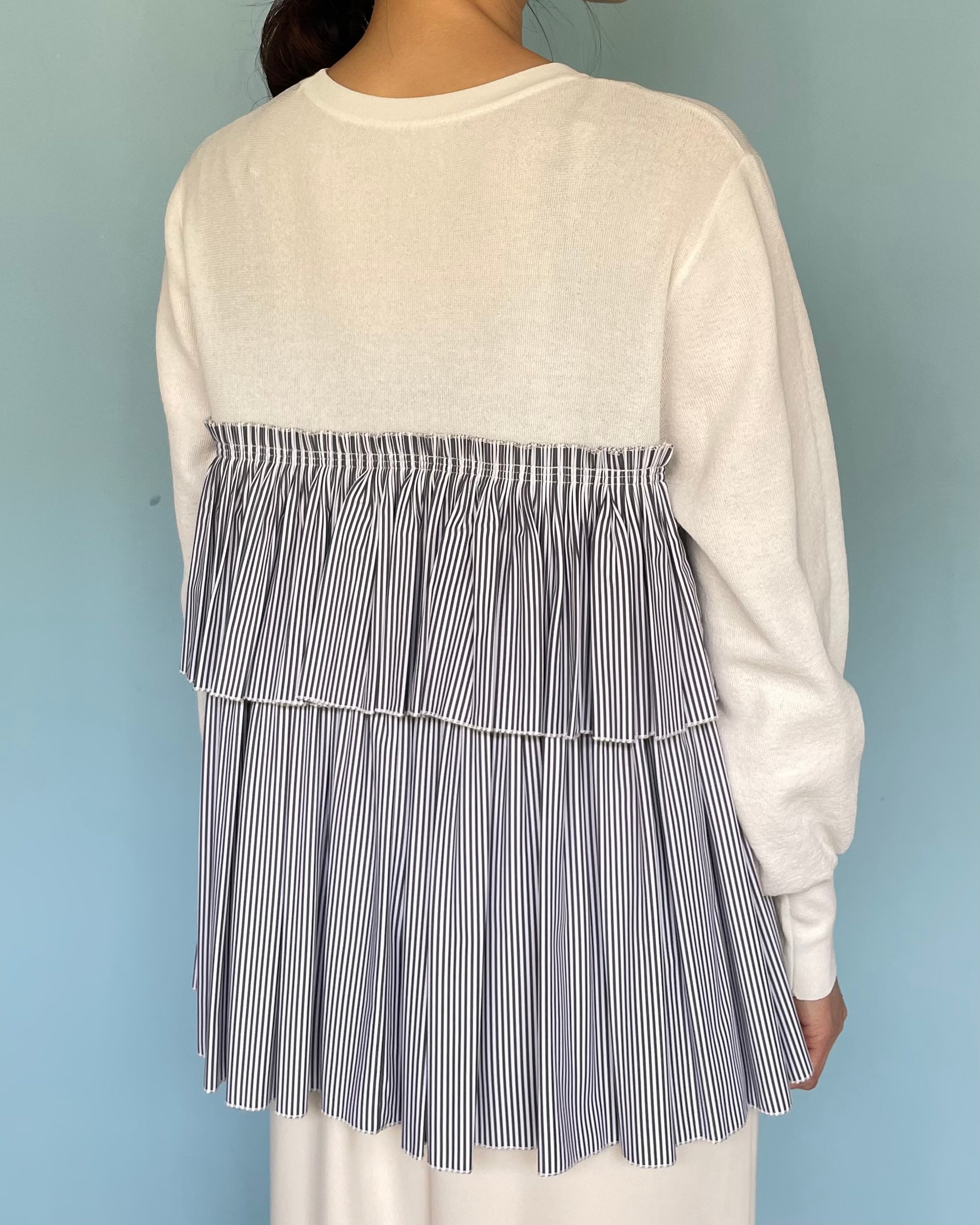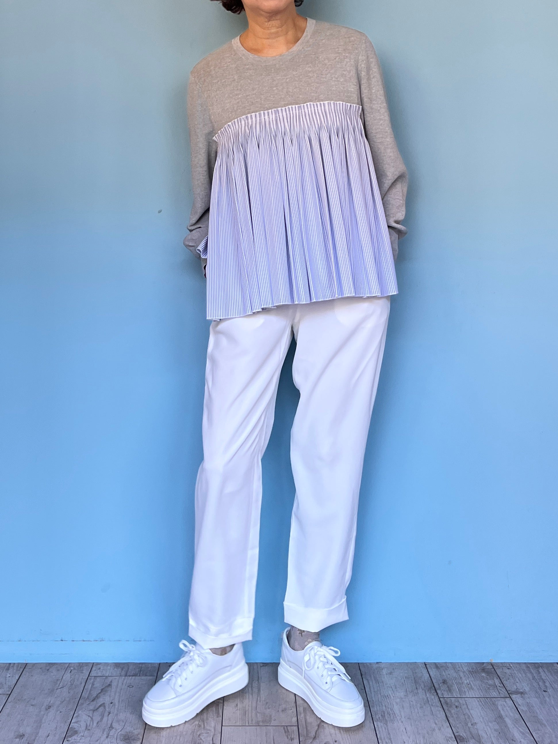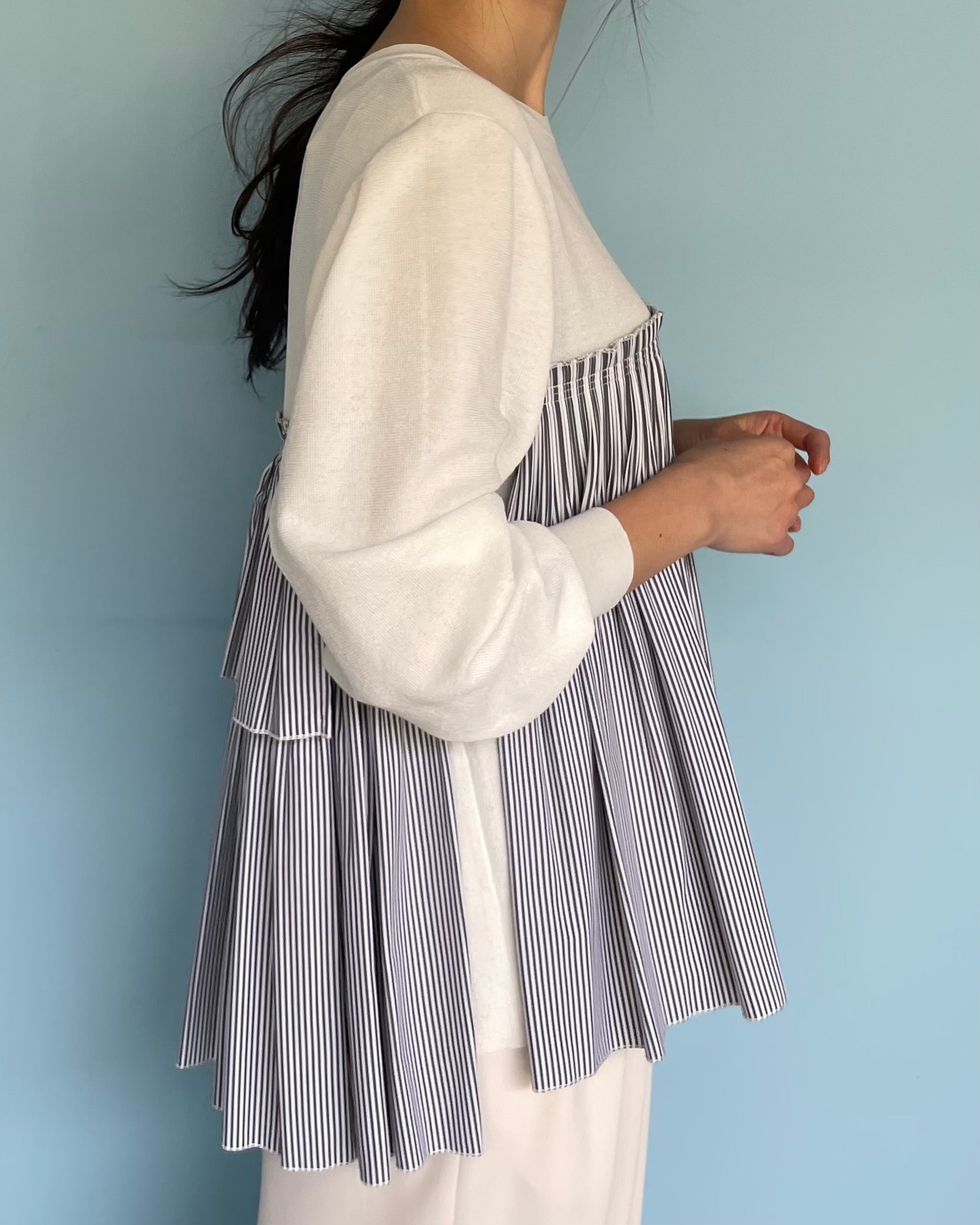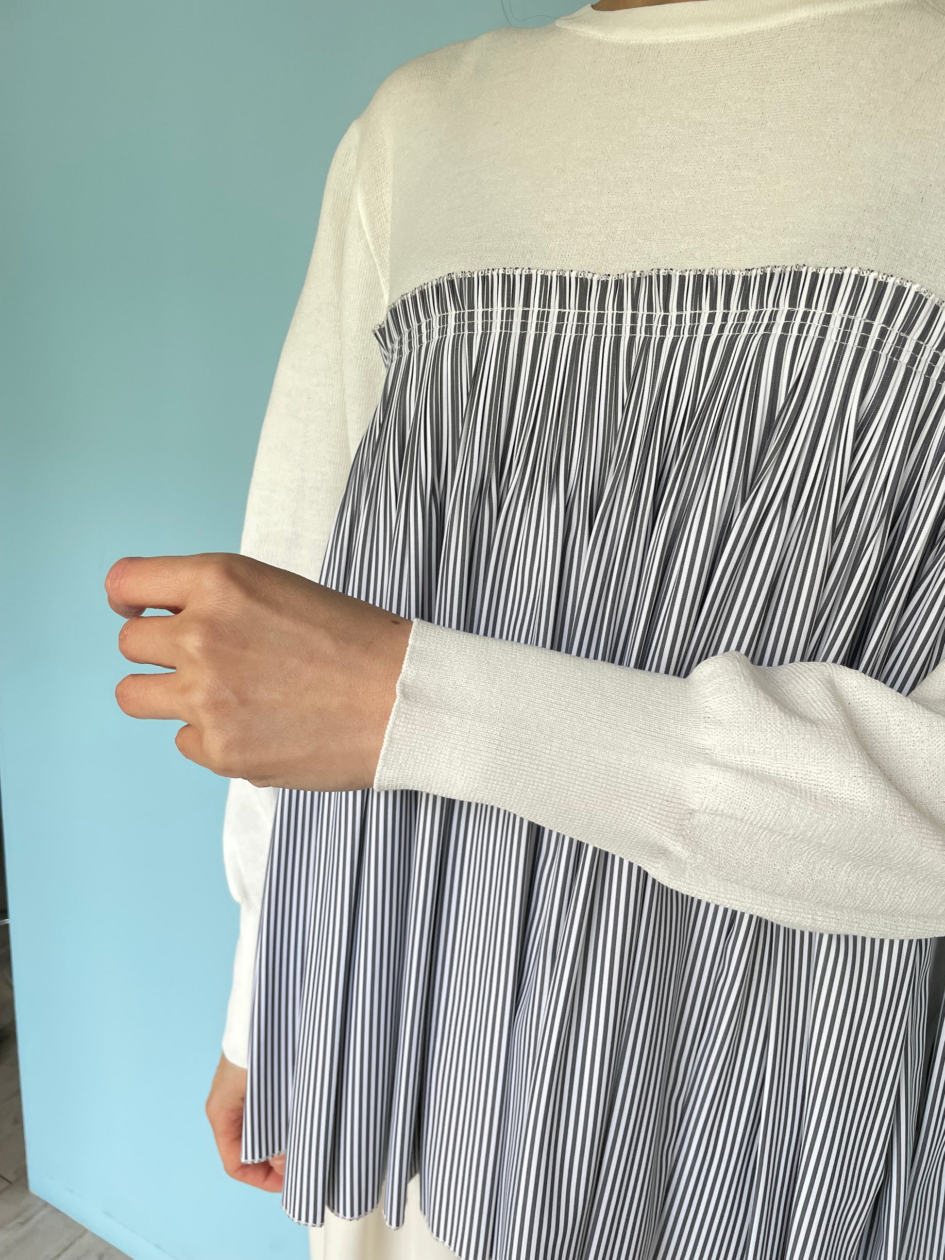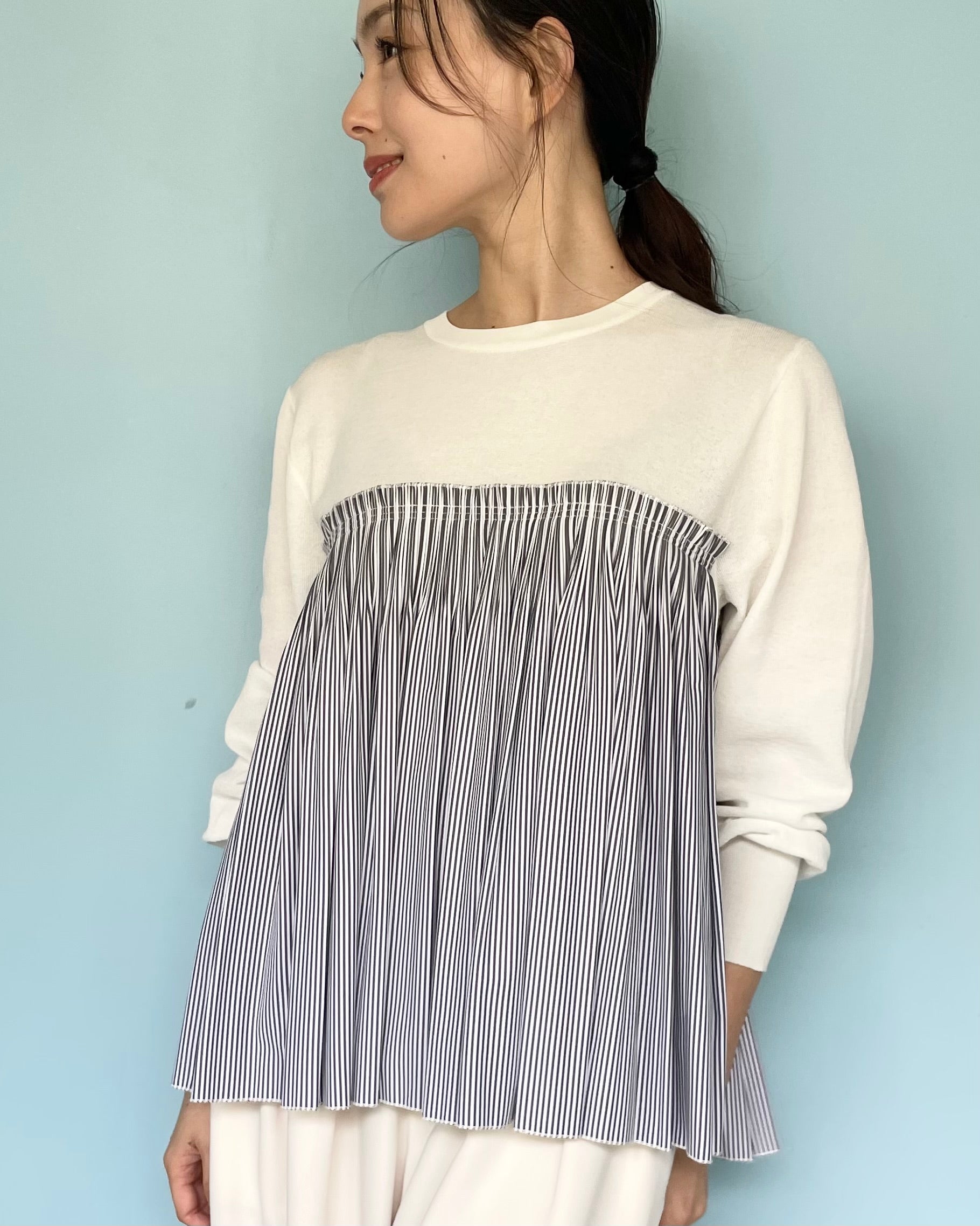 ストレッチの効いたニットのベースに、ストライプ柄のプリーツをドッキング。バストラインから広がるプリーツは胸回りを、Aラインのシルエットは、気になるお腹周りをカバーしてくれます。前は1段、後ろは2段重ねのプリーツは贅沢な生地感ながら、適度な落ち感でボリュームを感じさせず、むしろすっきりとした印象に見せてくれます。